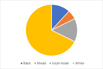 Most of my informants were actually born in London (25), while nine were born outside of London in Essex, Buckinghamshire, or outside of the UK in Poland, the Philippines, Jamaica, Nigeria, or Bangladesh. The diagram below shows the make-up of the sample by ethnicity (Black 4; Mixed 2; South Asian 4; White 23)